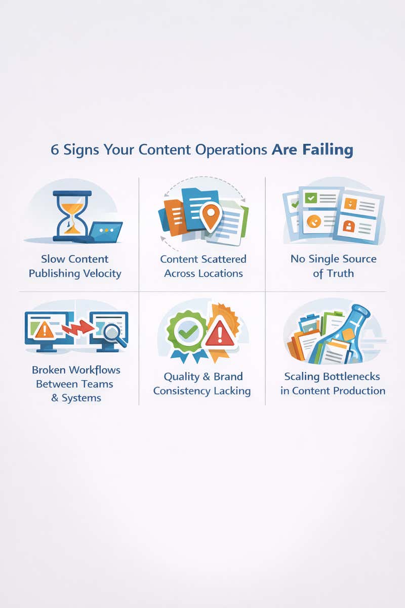 Slow content publishing velocity, a lack of a single source of truth, workflow breakdowns, and difficulty scaling are often signs of content operations issues.